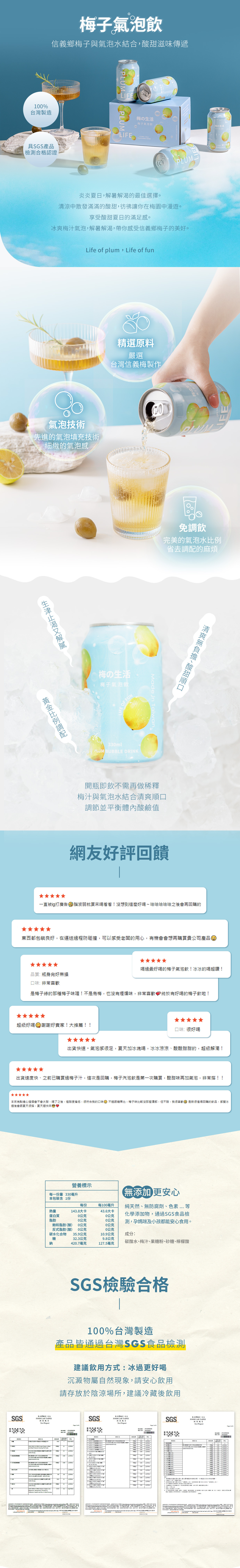 信義鄉梅子與氣泡水結合,酸甜滋味傳遞。細緻的氣泡與鮮嫩的梅子,讓你一飲難忘。